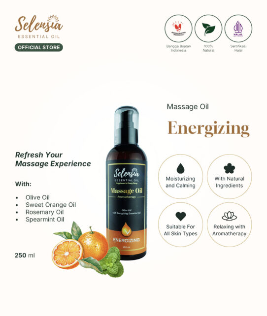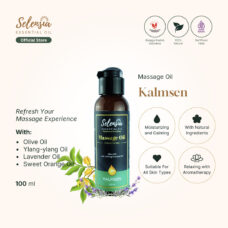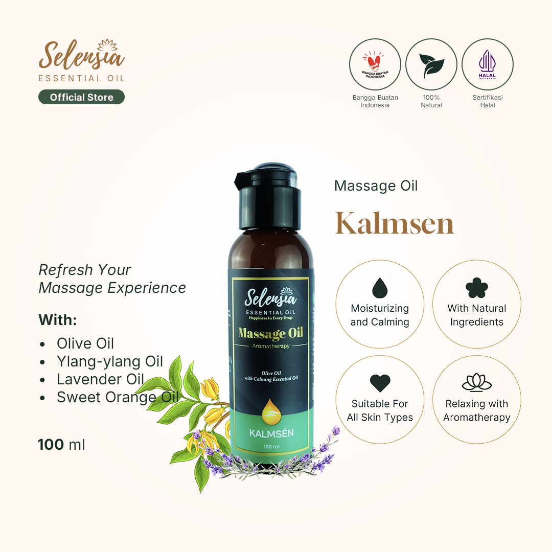 Selensia Kalmsen (Massage Oil Aromatherapy) merupakan minyak pijat alami yang mampu melembabkan kulit. Kandungan vitamin E alami dalam Olive Oil menutrisi dan meremajakan kulit, serta aroma essential oil dalam massage oil mampu memberikan efek relaksasi.